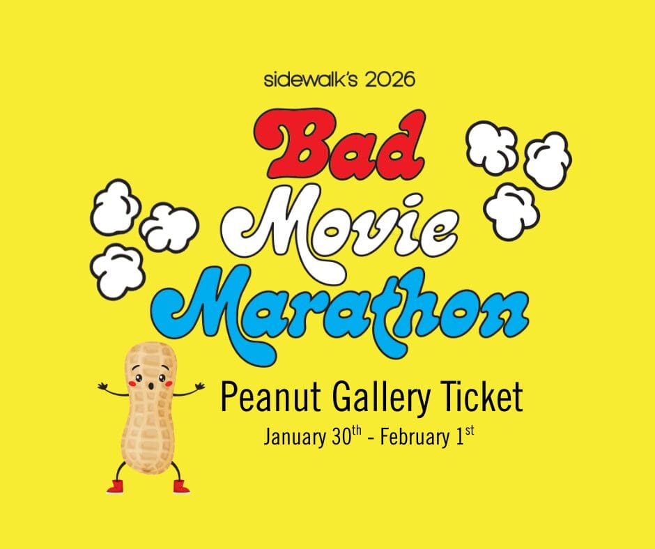 Want to drop in on the action for Sidewalk's famous Bad Movie Marathon fundraiser? For the first time ever, we're offering a Peanut Gallery ticket for two-hour viewing windows during cinema operating hours. For $15, you’ll catch whatever’s on screen—whether it’s an infamously bad movie or a wildly long Phish concert—and witness the sleepless antics of our marathoners. Multiple windows allowed (up to eight hours per day). No refunds, and not all content is all-ages appropiate. Interested in knowing more about being a marathoner? Learn more about Bad Movie Marathon below.