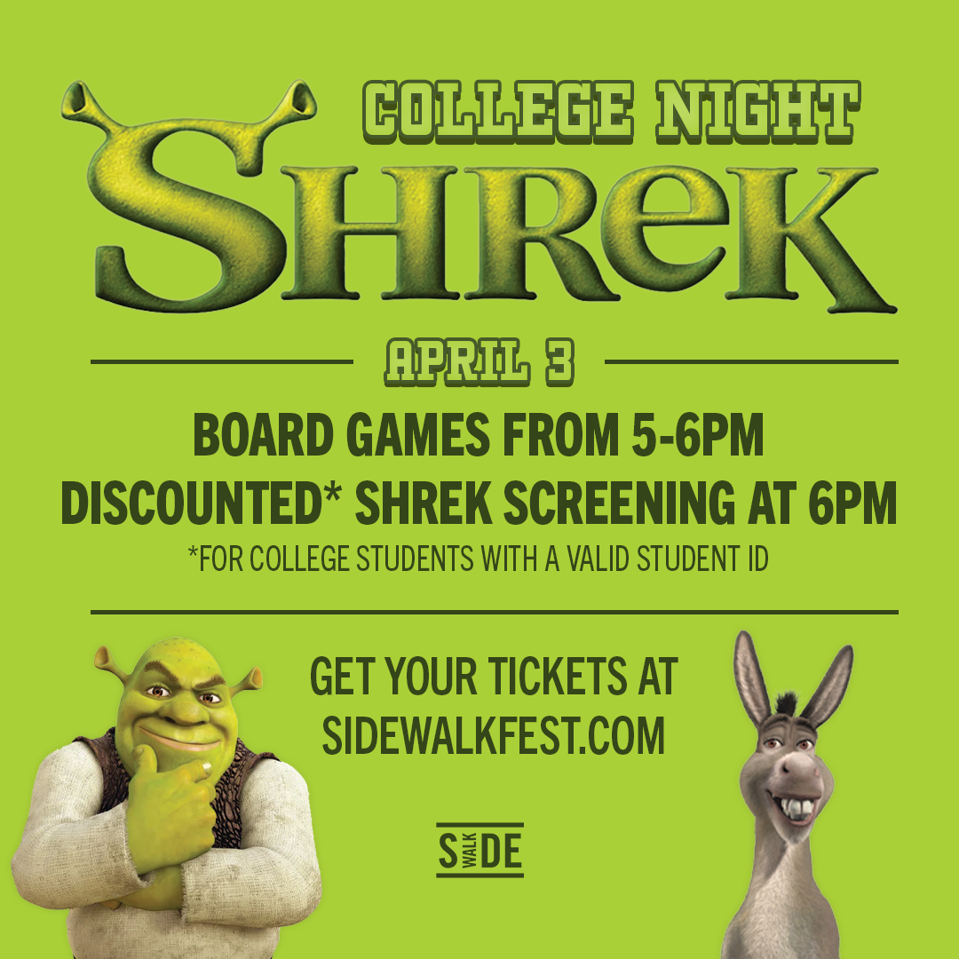 Join Sidewalk for the return of College Night! We'll have free play board games in the lobby from 5-6pm with opportunities to network with your peers followed by a $8 discounted screening of Shrek with a valid college ID.