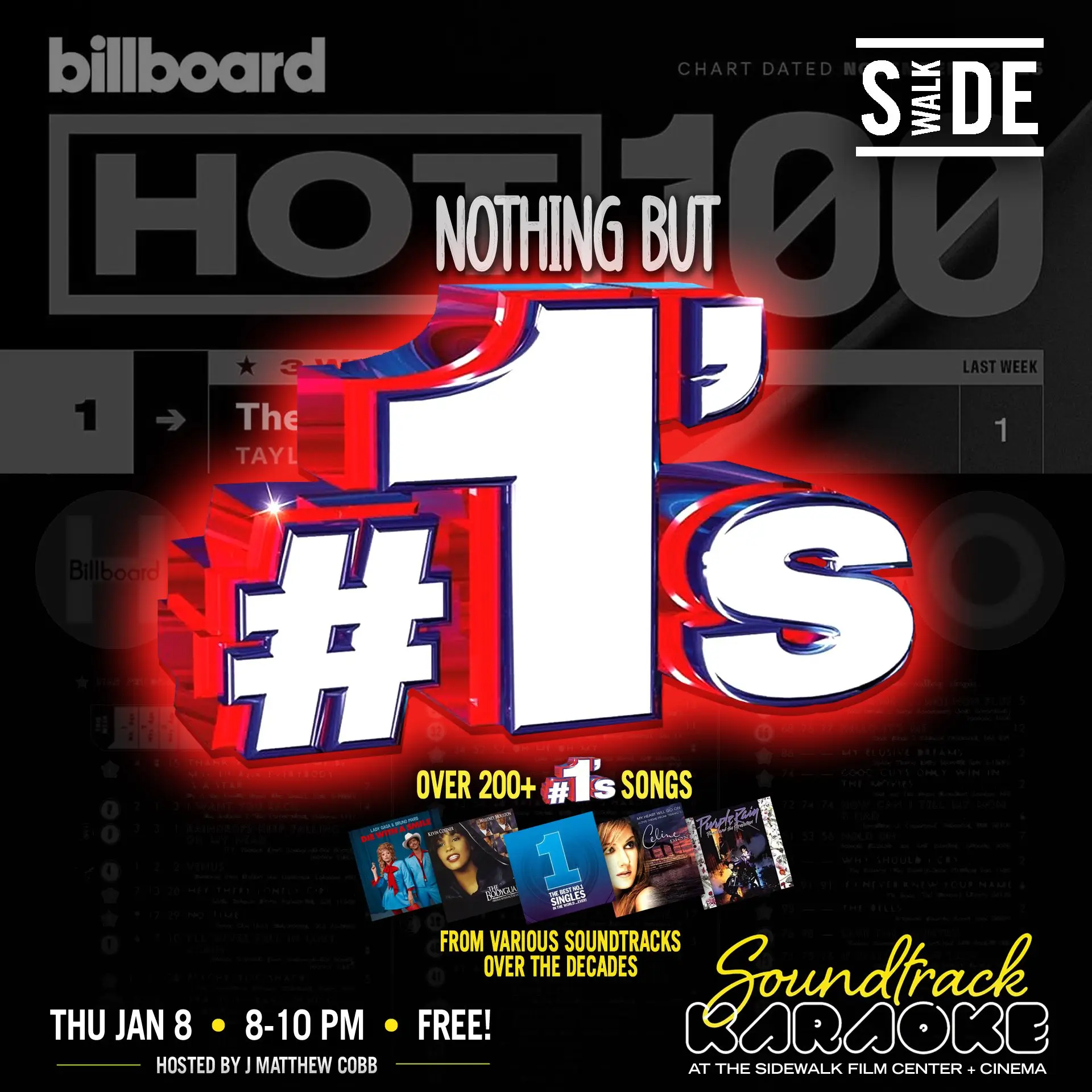 - Nothing but #️⃣1️⃣’s are on the mic! 🎙️ For the month of January, Soundtrack Karaoke will be pulling the number one hits on the 🎶 Billboard Hot 100 💿 from over the decades on a range of motion picture + TV soundtracks. Over 200+ songs to choose from, like Whitney Houston's "I Will Always Love You," Céline Dion's "My Heart Will Go On," Prince's "When Doves Cry" and even fresh giant smash hits like Alex Warren's "Ordinary" and Lady Gaga + Bruno Mars's "Die With a Smile." Hosted by J Matthew Cobb * This is a free event. Reservations are strongly recommended but not required. SEATING IS FIRST COME, FIRST SERVED. *