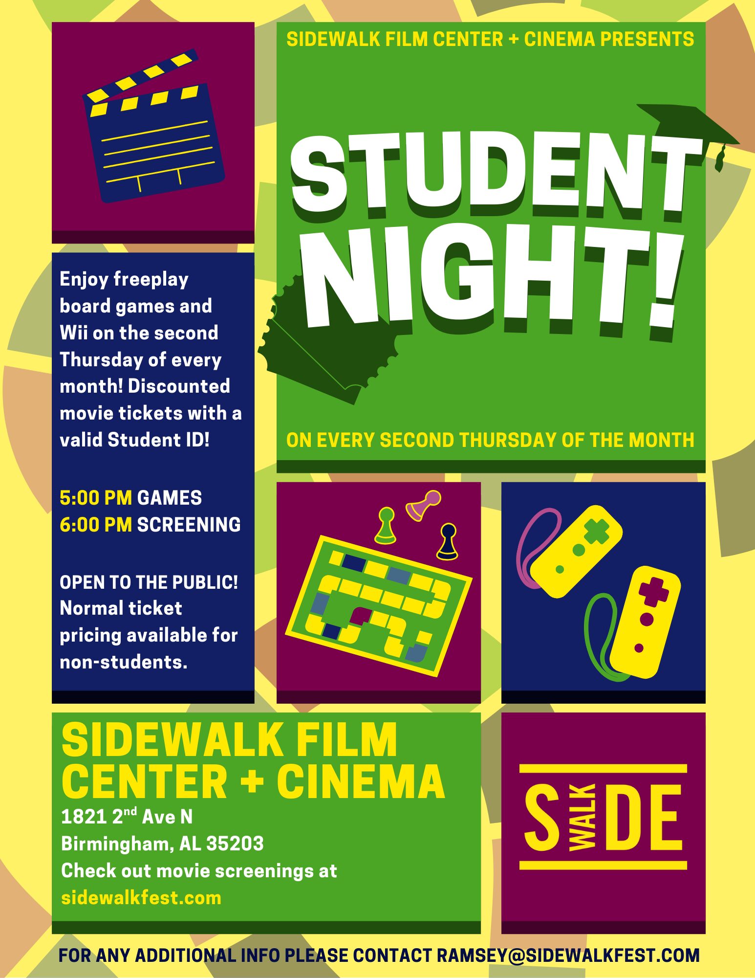 - Welcome to Sidewalk's new Monthly Student Movie Night! Join us in the lobby before the film for board games, Wii, and a social hour from 5pm - 6pm. Followed by a discounted screening of a different film each month. The screening is open to the public, but students get discounted tickets with a Valid Student ID (must present in box office for discount)