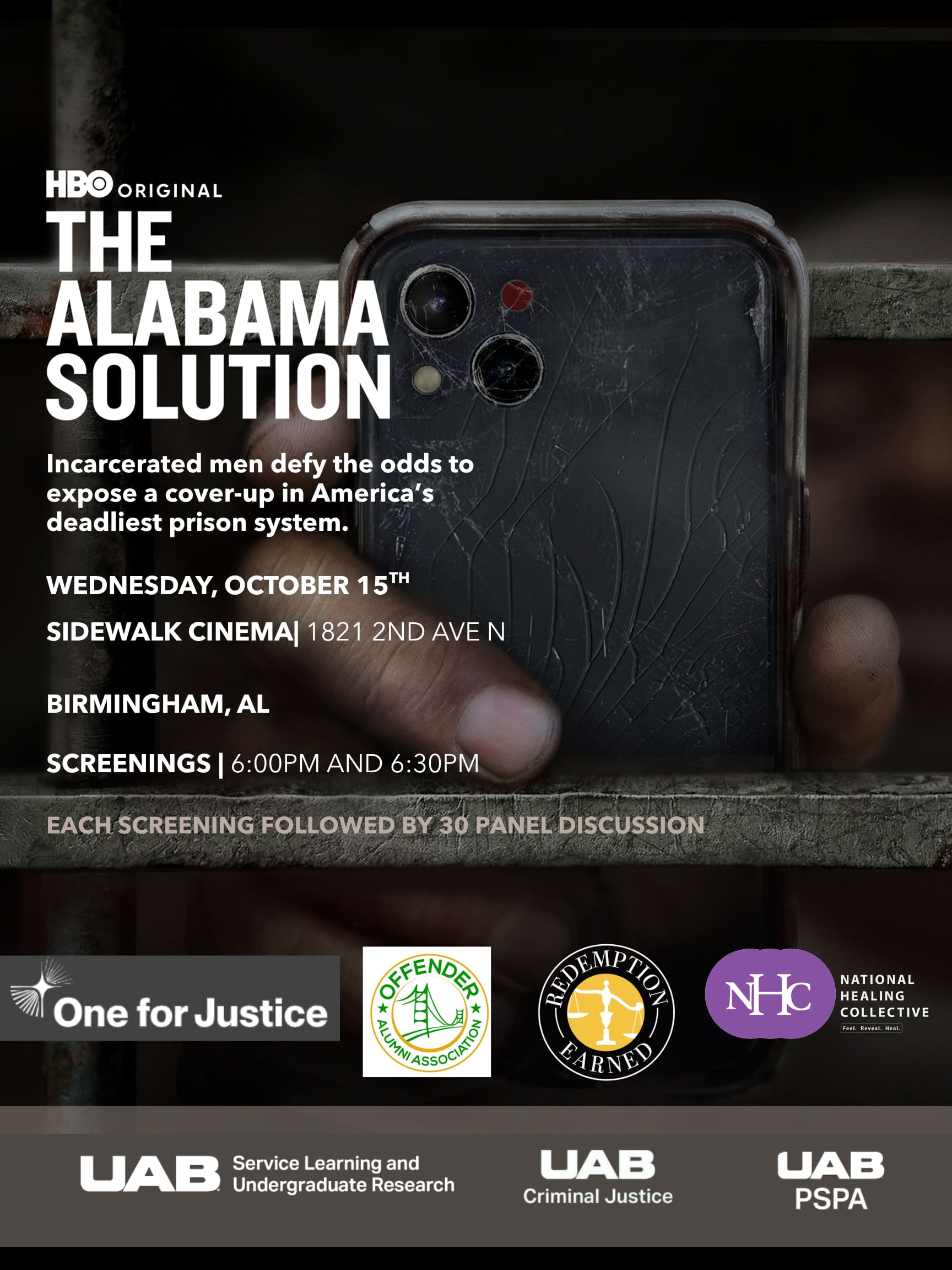 The Alabama Solution, directed by Andrew Jarecki and Charlotte Kaufman, is an HBO documentary that exposes conditions inside Alabama’s prisons – overcrowding, abuse, forced labor, corruption, and cover-ups – through firsthand cell phone footage captured by men incarcerated in Alabama prisons. We're proud to host a free community screening in collaboration with community partners, Offenders Alumni Association, Redemption Earned, The Healing Network, and UAB, through a grant from One for Justice. Following each screening, there will be a 30-minute panel discussion with Beth Shelburne, Chris England, Dena Dickerson, and Erick Buchanan. We're proud to host a free community screening of The Alabama Solution, an HBO Documentary Film exposing the crisis inside Alabama's prisons. This screening is a collaboration between community partners Offenders Alumni Association, Redemption Earned, Healing Network and UAB through a grant from One for Justice. Each screening will be followed by a 30 minute panel discussion with Beth Shelburne, Chris England, Dena Dickerson and Erick Buchanan. *This is a free event. Reservations are strongly recommended but not required. PLEASE NOTE: SEATING IS FIRST COME, FIRST SERVED*