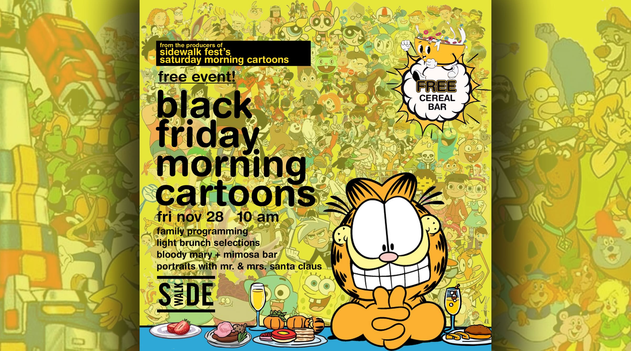 FRIDAY, bring the entire family out to a new twist on an old favorite with our FREE Black Friday Morning Cartoons! Featuring family programming, light breakfast options for all ages, a free cereal bar, and a Bloody Mary & Mimosa bar for adults, and photo-ops with Mr. + Mrs. Santa Claus from 9:30am – 12:30pm!