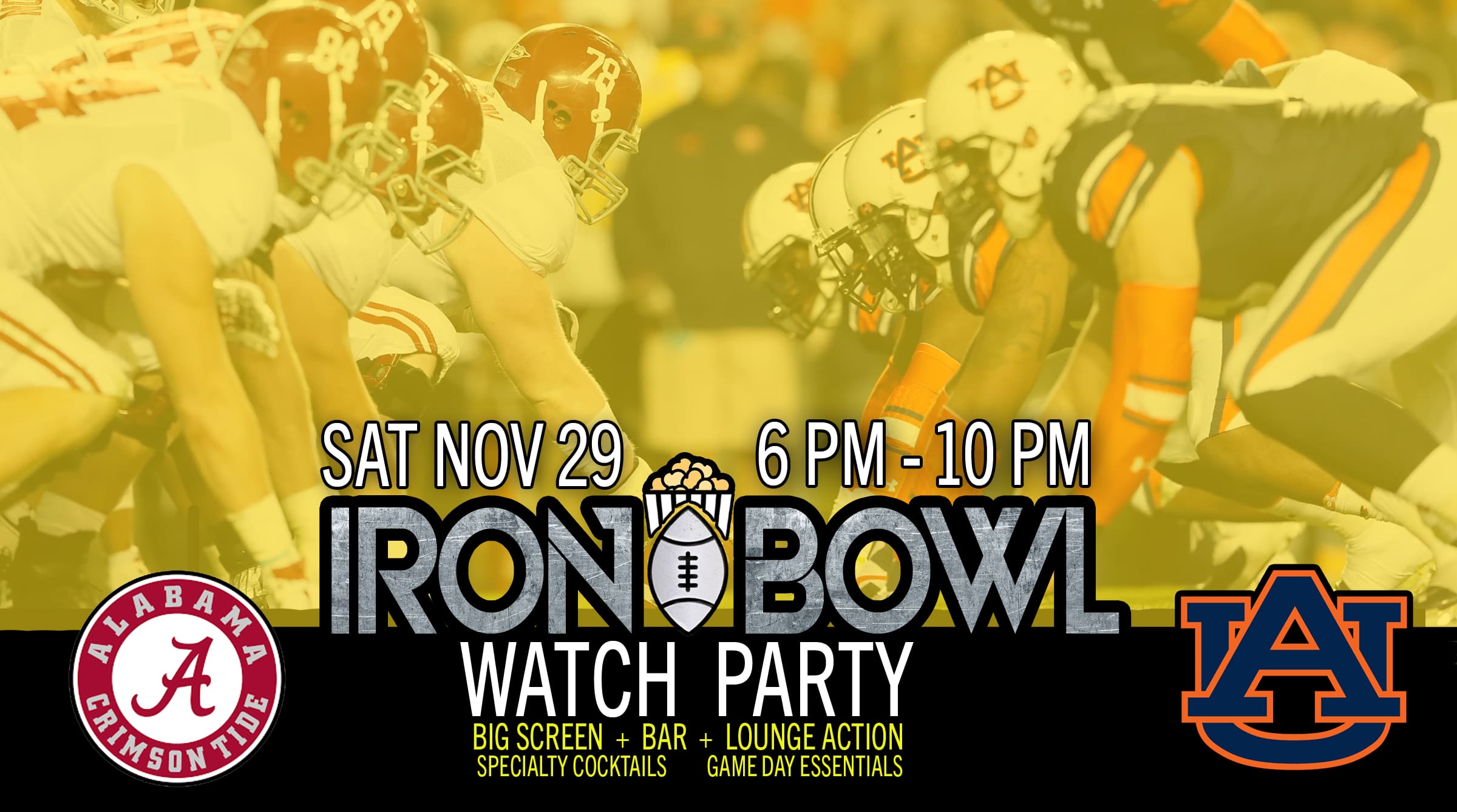 SATURDAY, join us for the biggest game of the South…on the BIG SCREEN! At our FREE Iron Bowl Watch Party, the game will be shown in the theatre, plus all of our tvs in the bar and lounge. Kickoff is scheduled for 6:30 pm, so be sure to get here early and claim your seat! There will be game day decor and party essentials (while supplies last). We’ll also have Iron Bowl-themed specialty cocktails at the bar along with the continuation of our Black Friday Sale. Seating is first come, first served.